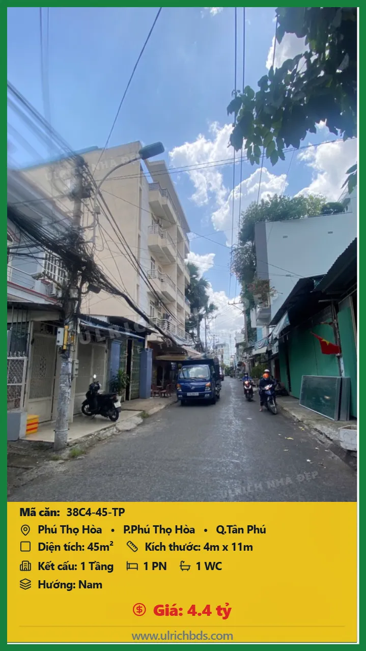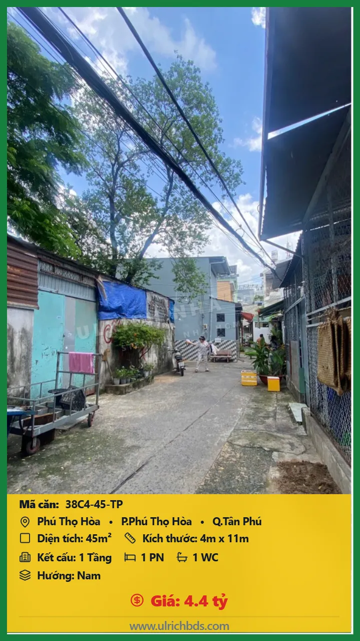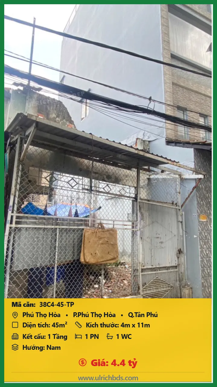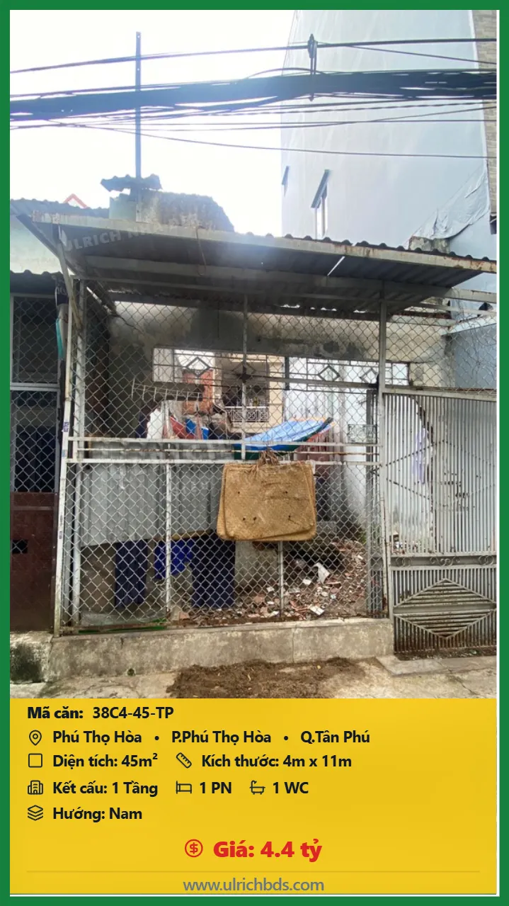 Bán Cũ nát Diện tích 45m2 1 tầng đường Phú Thọ Hòa P. Phú Thọ Hòa Q. Tân Phú 💰Giá 4.4 tỷ