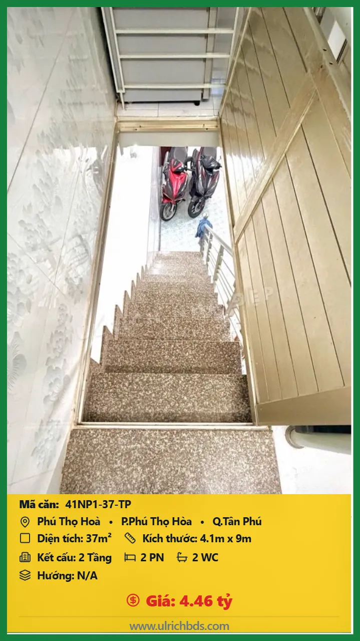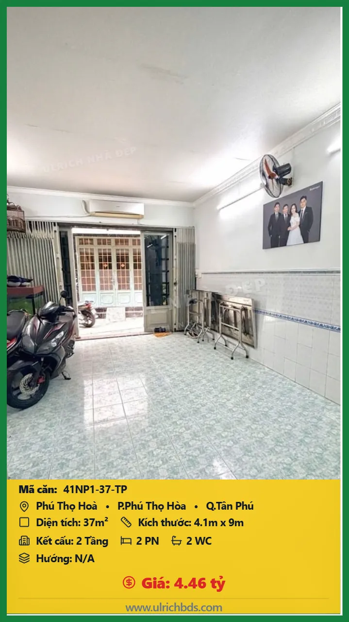 Bán Nhà phố hẻm Diện tích 37m2 2 tầng đường Phú Thọ Hòa P. Phú Thọ Hòa Q. Tân Phú 💰Giá 4.46 tỷ