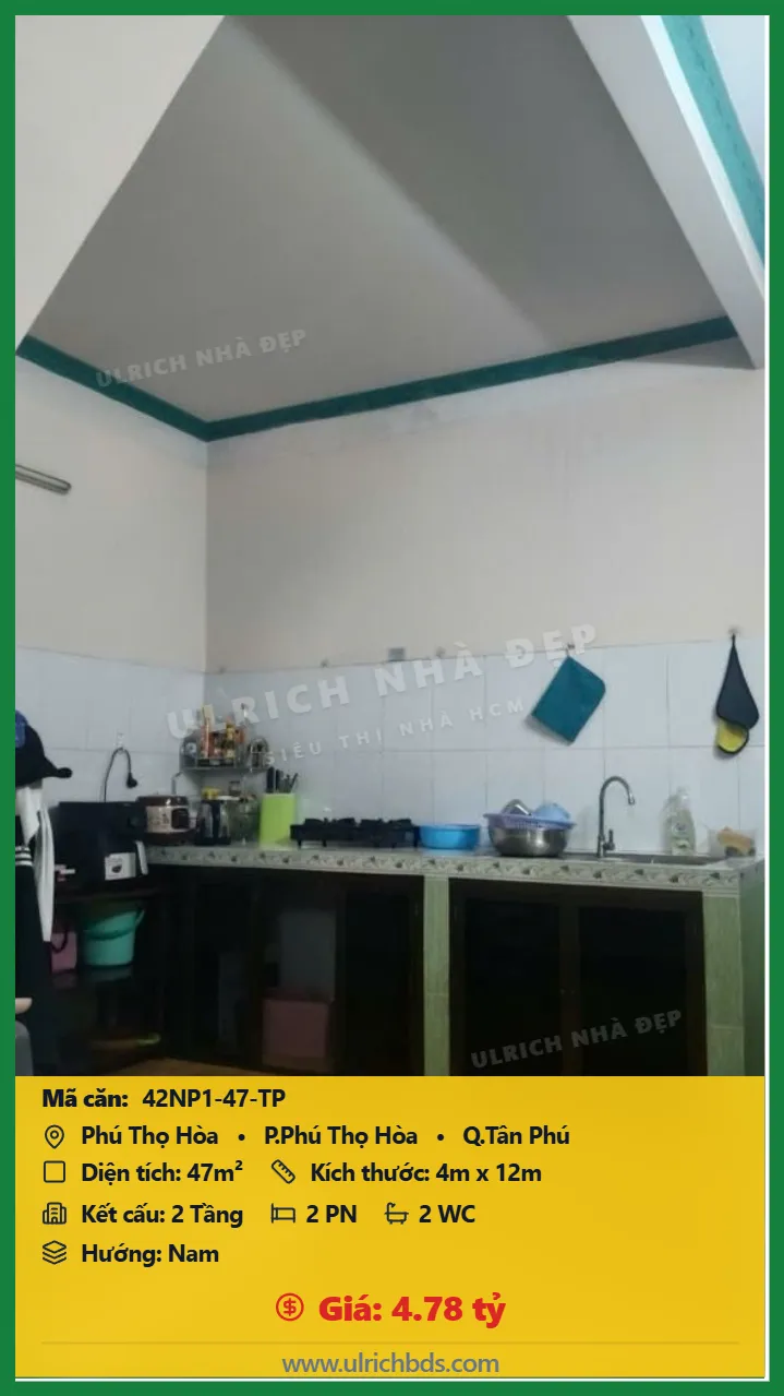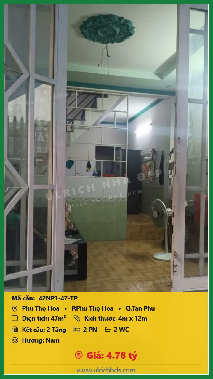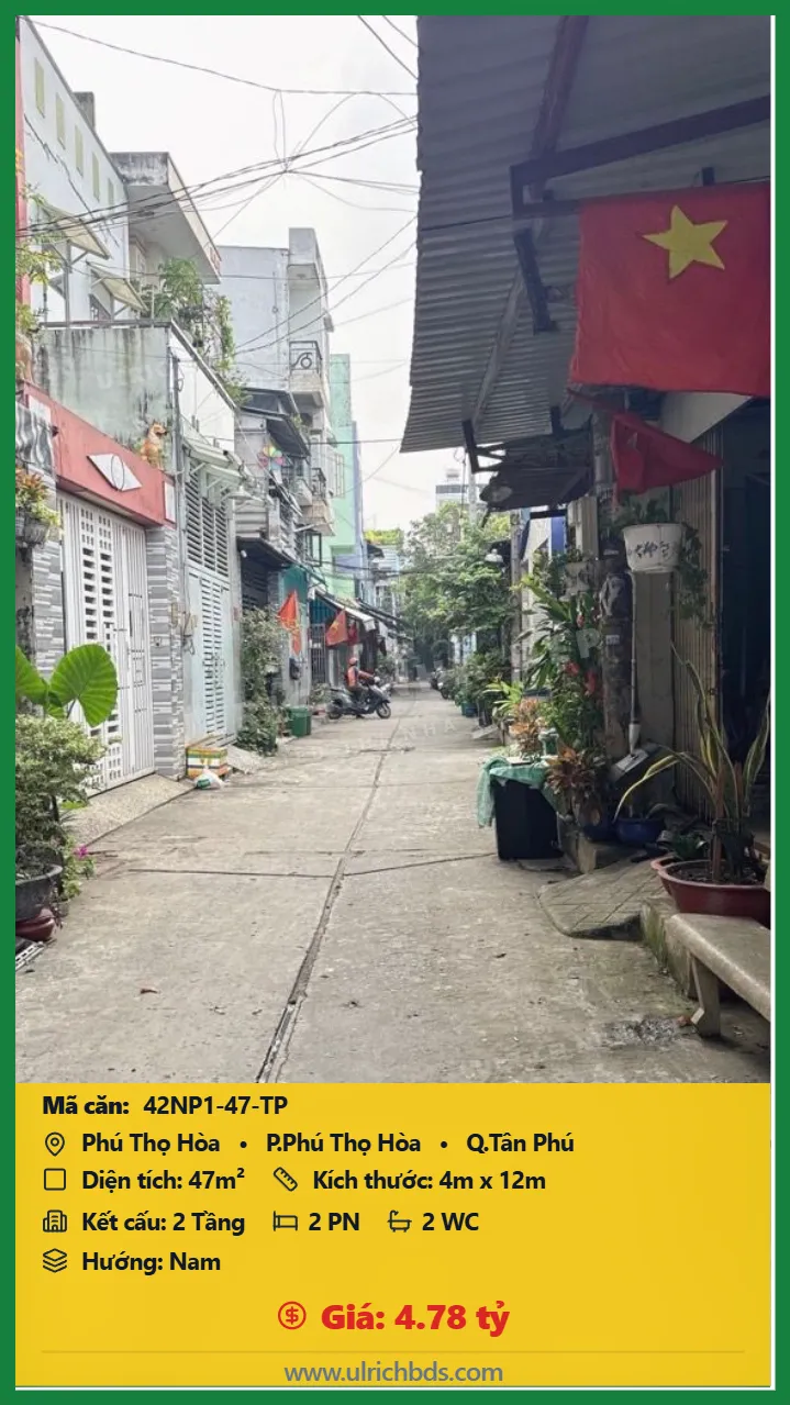 Bán Nhà phố hẻm Diện tích 47m2 2 tầng đường Phú Thọ Hòa P. Phú Thọ Hòa Q. Tân Phú 💰Giá 4.78 tỷ