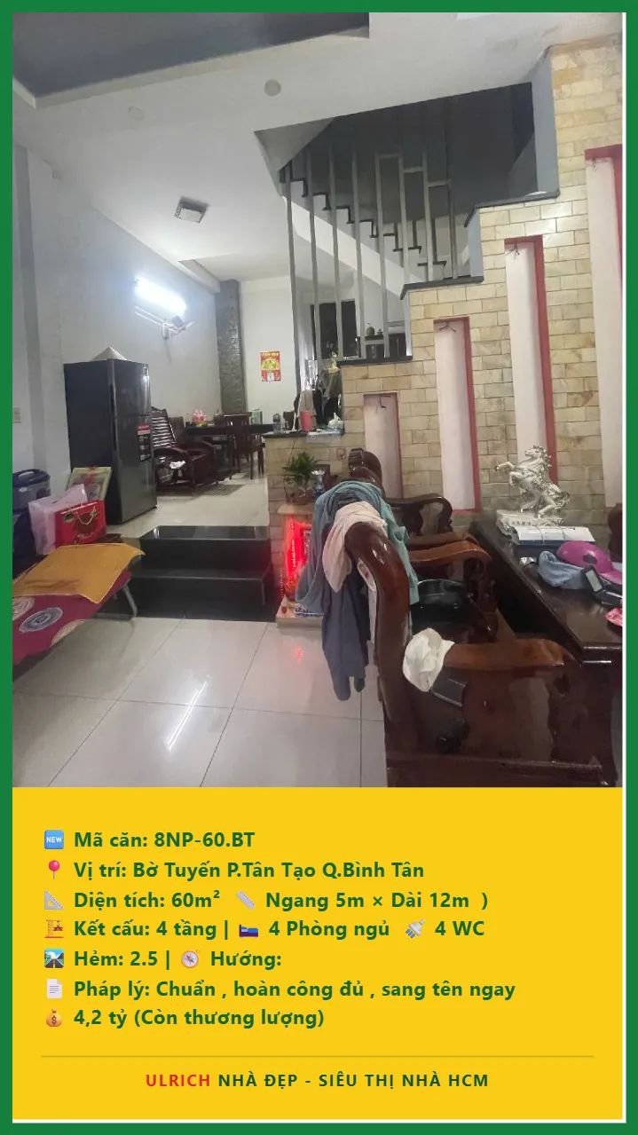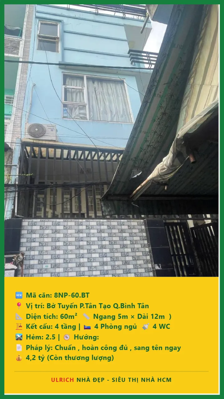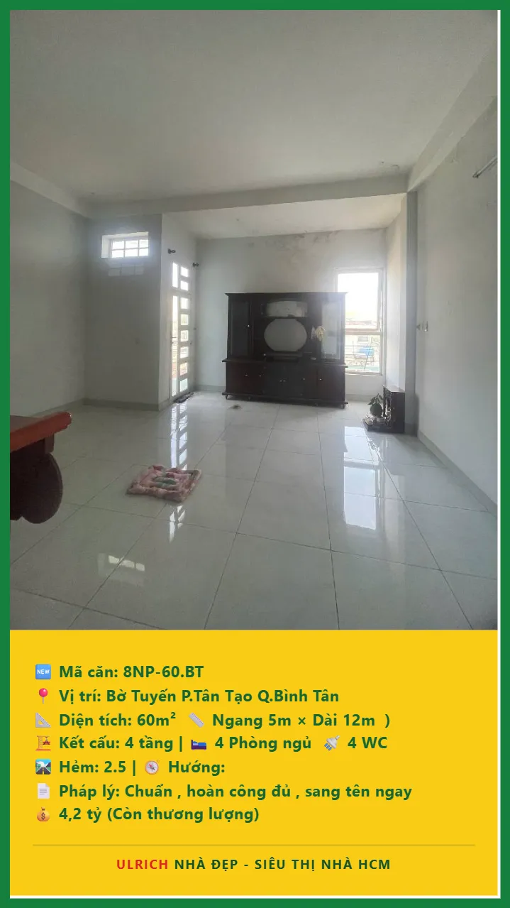Bán Nhà phố hẻm Diện tích 60m2 4 tầng đường Bờ Tuyến P. Tân Tạo Q. Bình Tân 💰Giá 4.2 tỷ