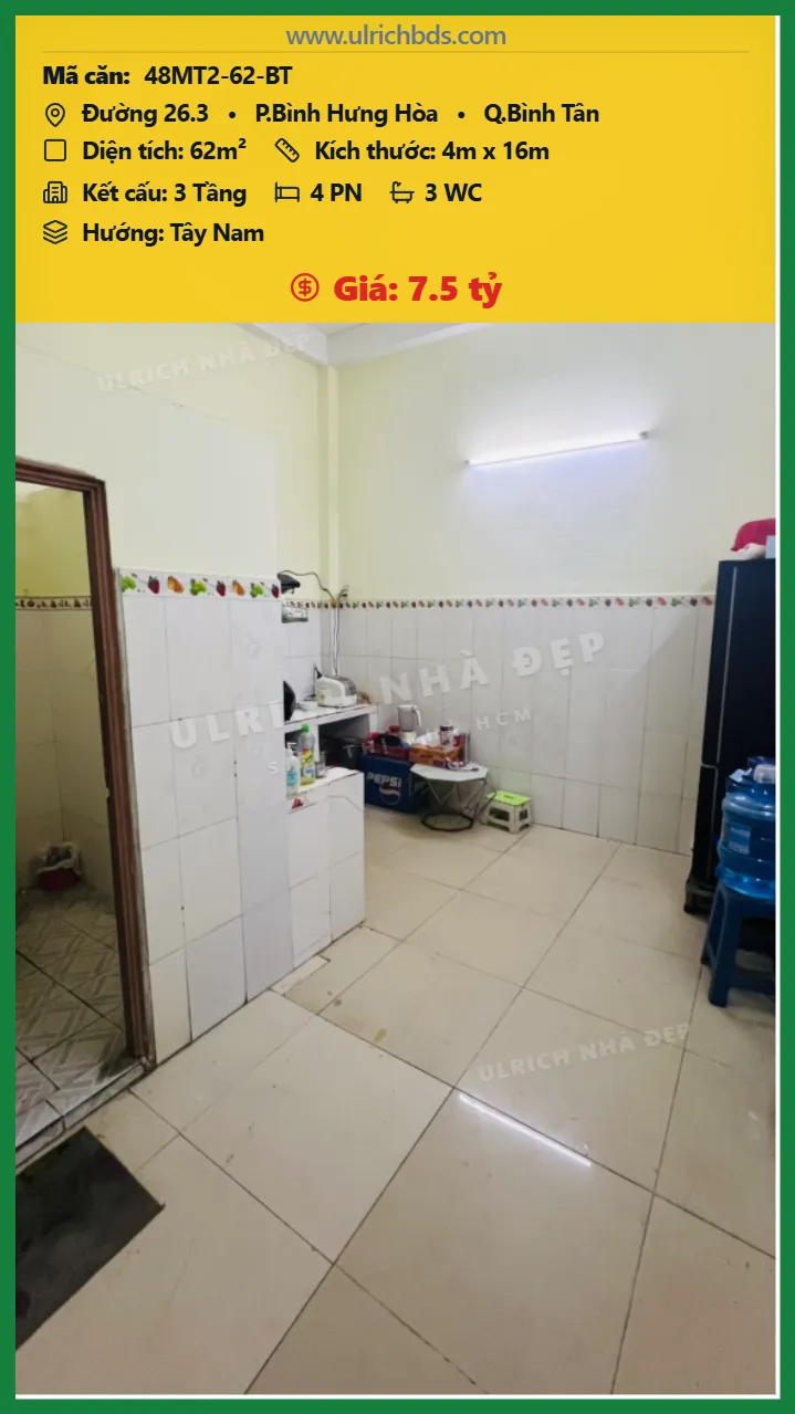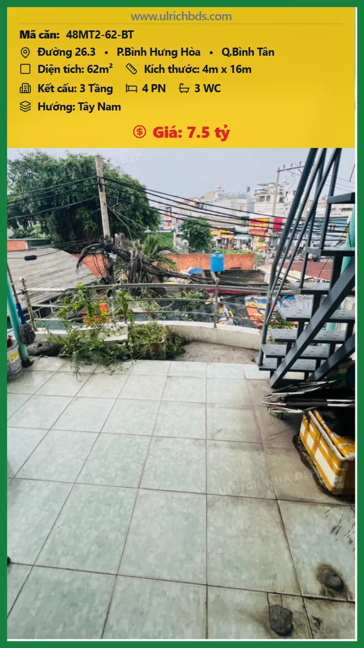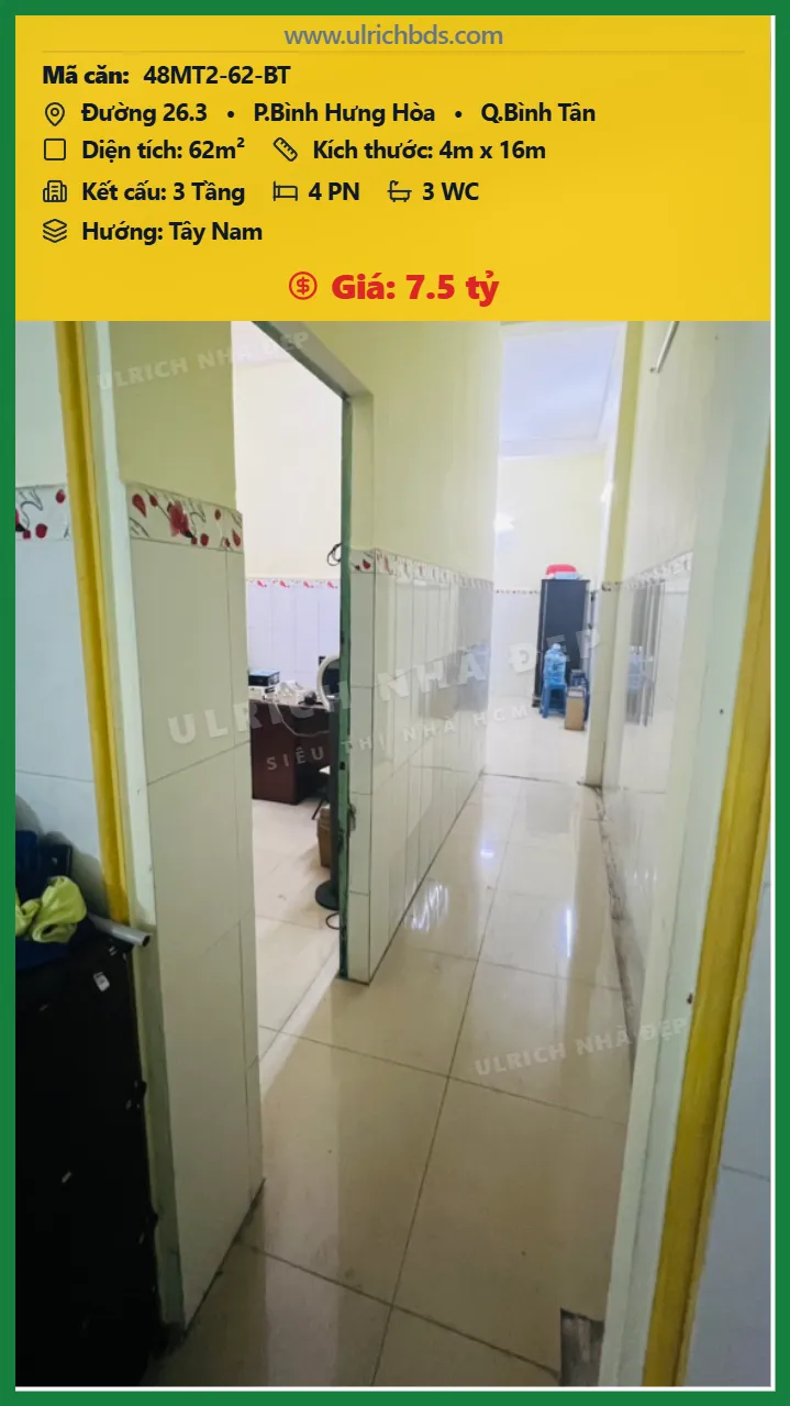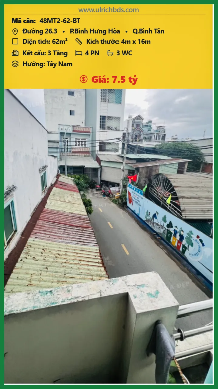 Bán Nhà mặt tiền Diện tích 62m2 3 tầng đường Đường 26.3 P. Bình Hưng Hòa Q. Bình Tân 💰Giá 7.5 tỷ