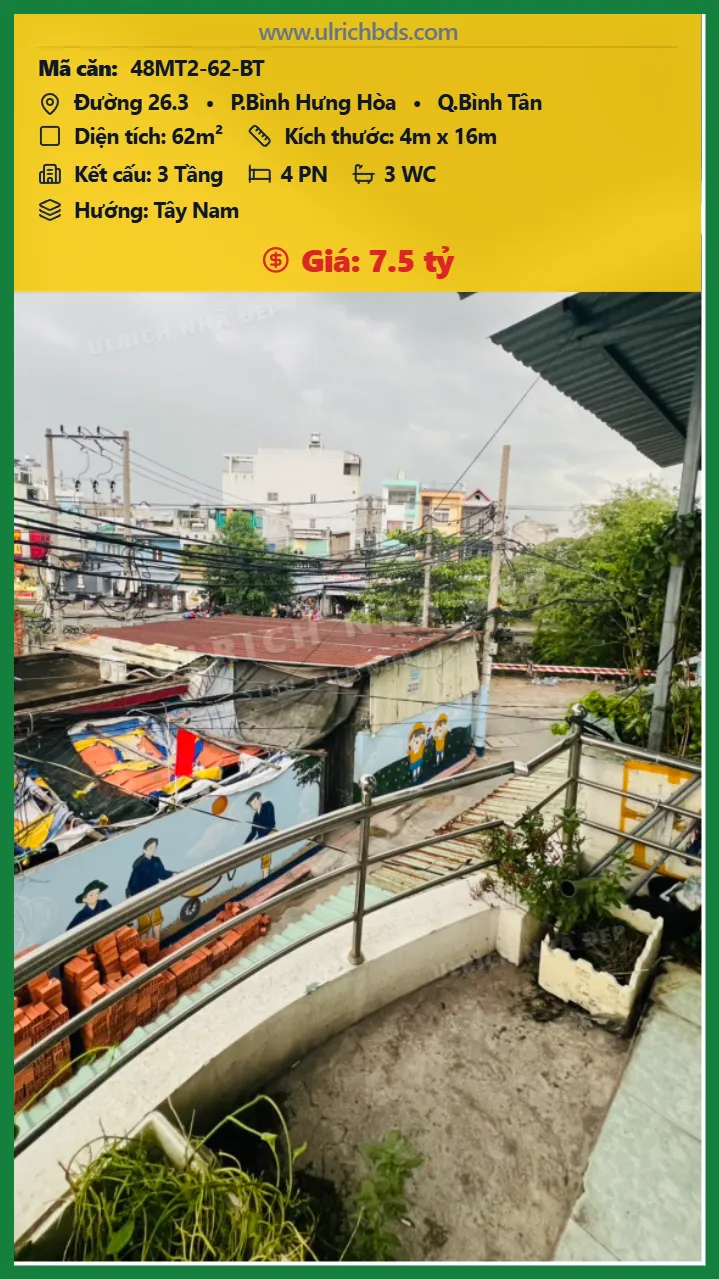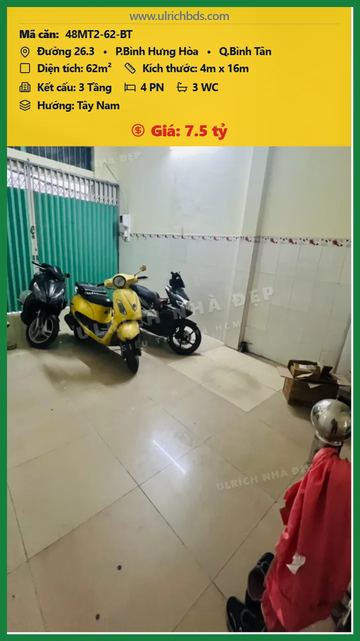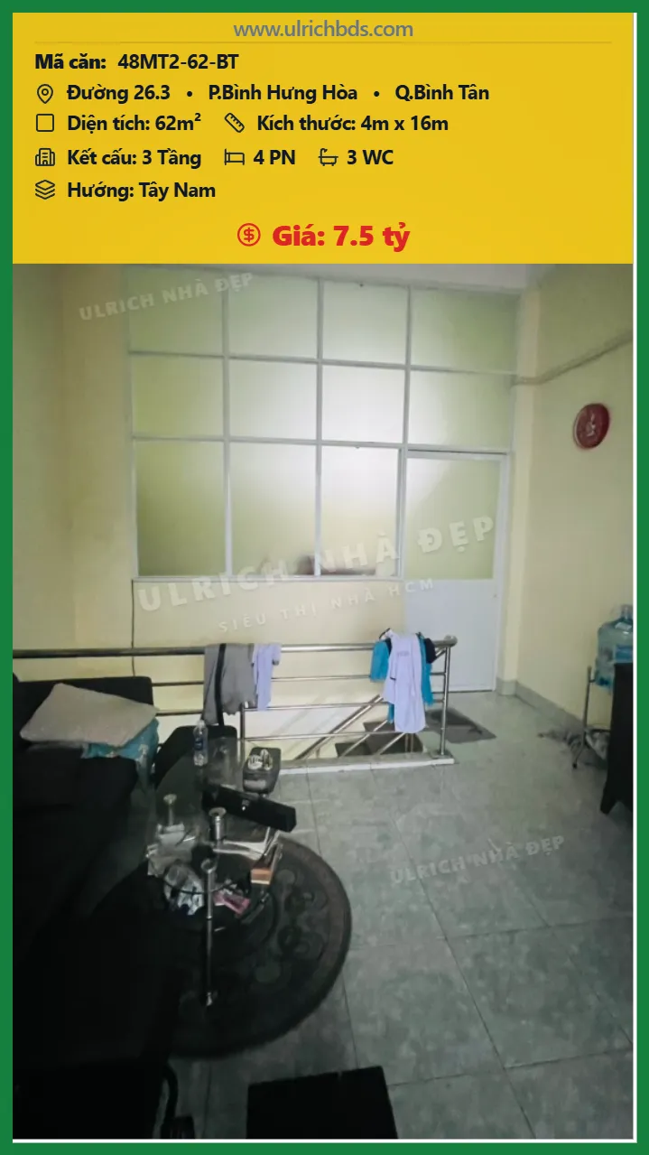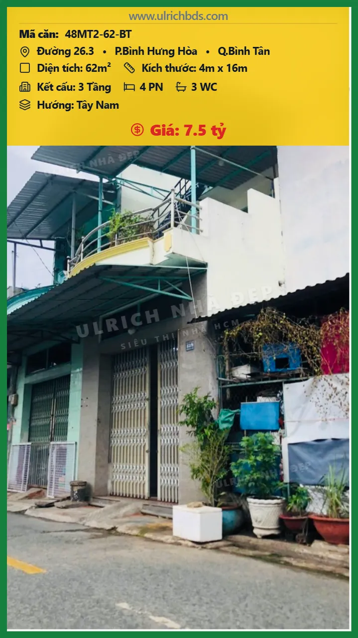 Bán Nhà mặt tiền Diện tích 62m2 3 tầng đường Đường 26.3 P. Bình Hưng Hòa Q. Bình Tân 💰Giá 7.5 tỷ