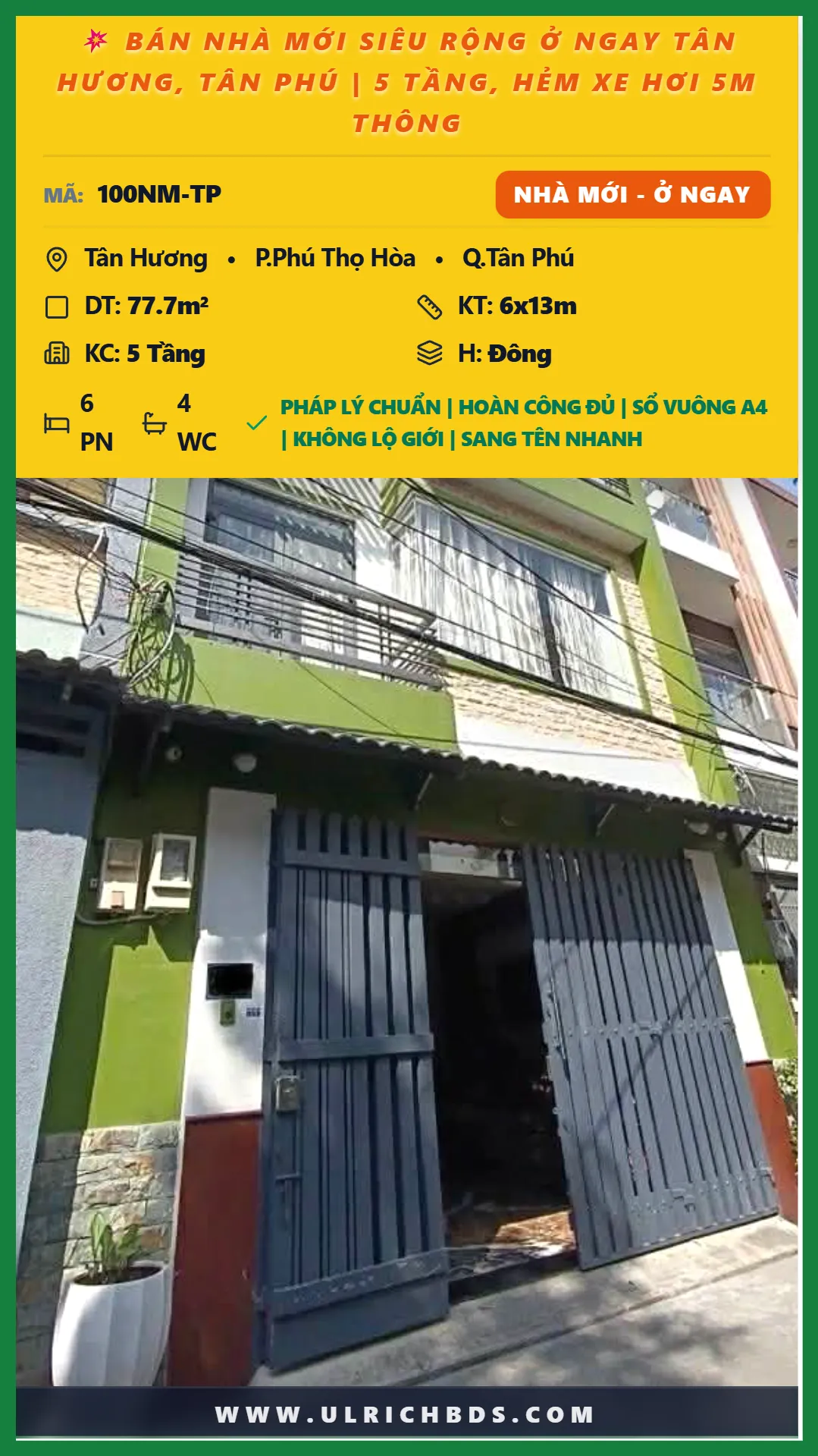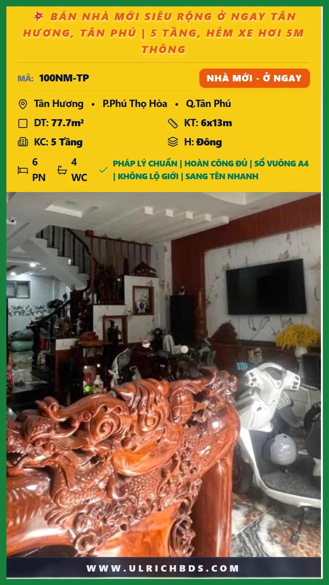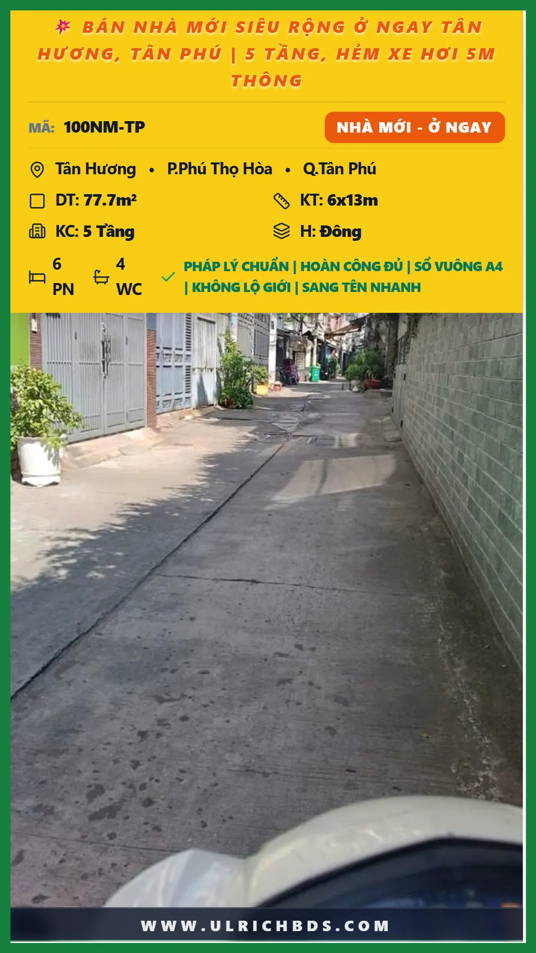Vị trí: Đường Tân Hương, phường Phú Thọ Hòa, quận Tân Phú. Hẻm xe hơi 5m thoáng mát, thông ra hẻm 52, thuận tiện di chuyển. Gần trường học, chợ và bệnh viện – khu dân cư an ninh, tiện ích đầy đủ.