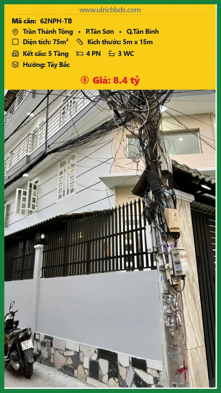 Bán Nhà phố hẻm Diện tích 75m2 5 tầng đường Trần Thánh Tông P. Tân Sơn Q. Tân Bình 💰Giá 8.4 tỷ