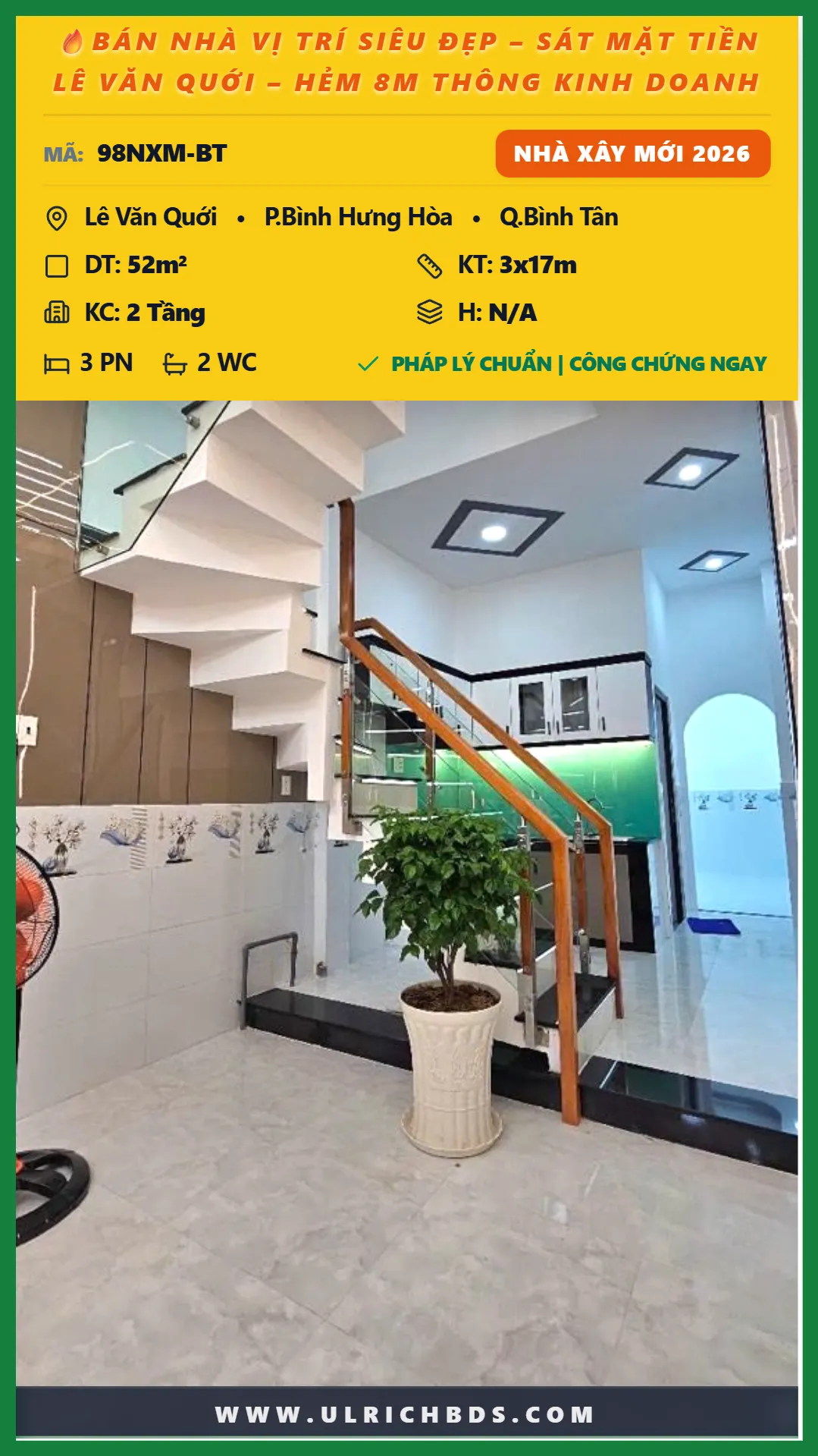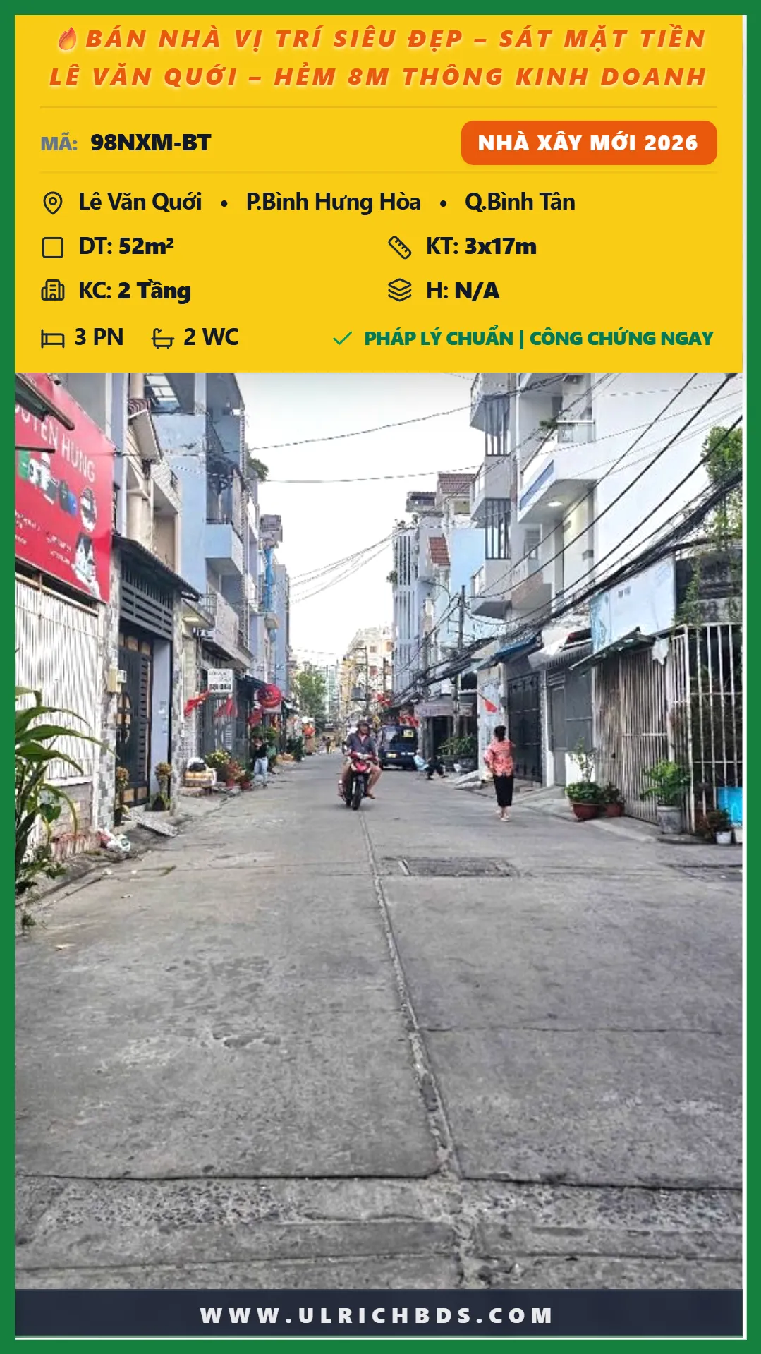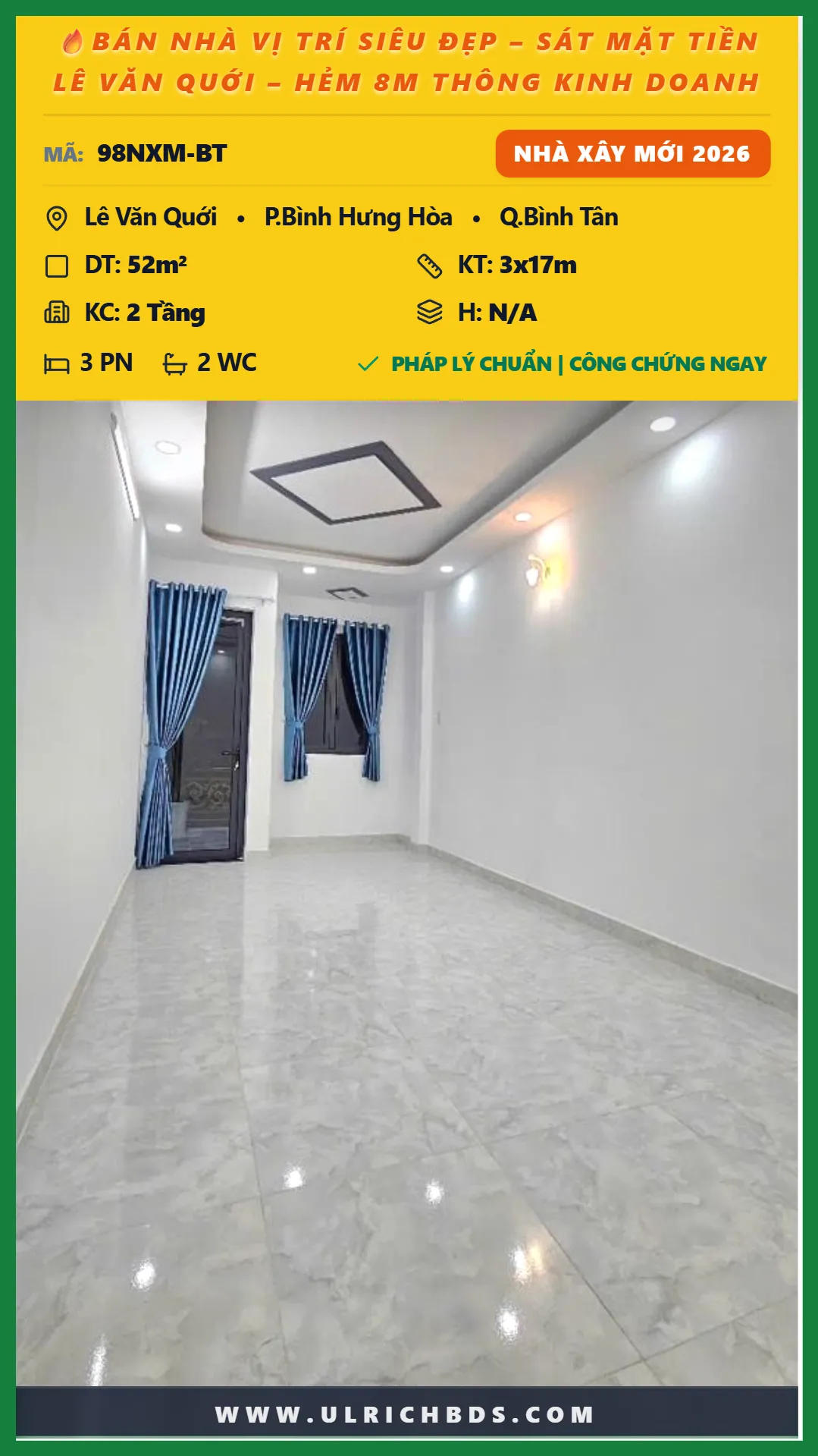 BÁN NHÀ VỊ TRÍ SIÊU ĐẸP – SÁT MẶT TIỀN LÊ VĂN QUỚI – HẺM 8M THÔNG KINH DOANH – GẦN NGÃ TƯ 4 XÃ – GIÁP RANH TÂN PHÚ – SIÊU PHẨM KHÔNG TỲ VẾT