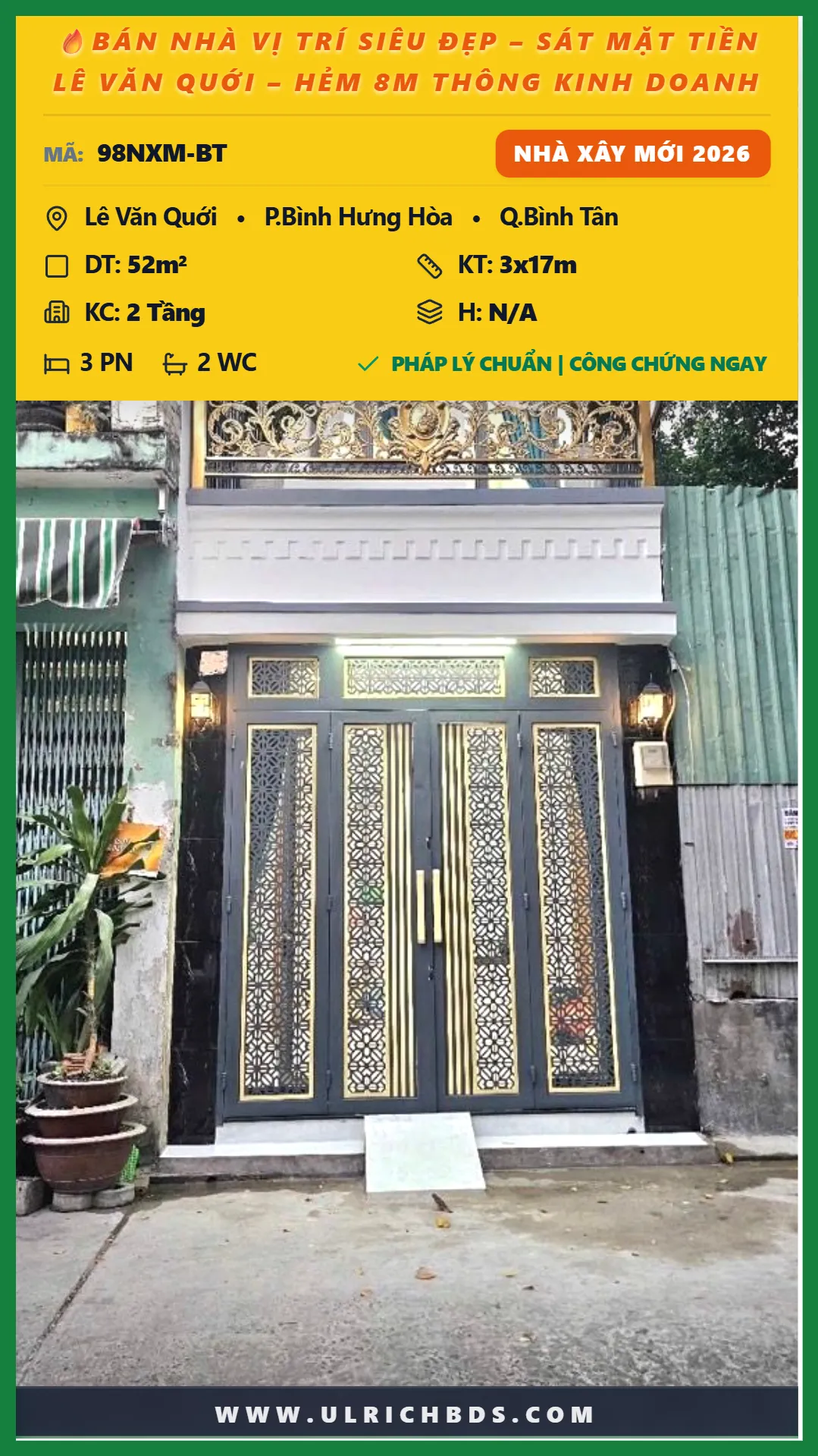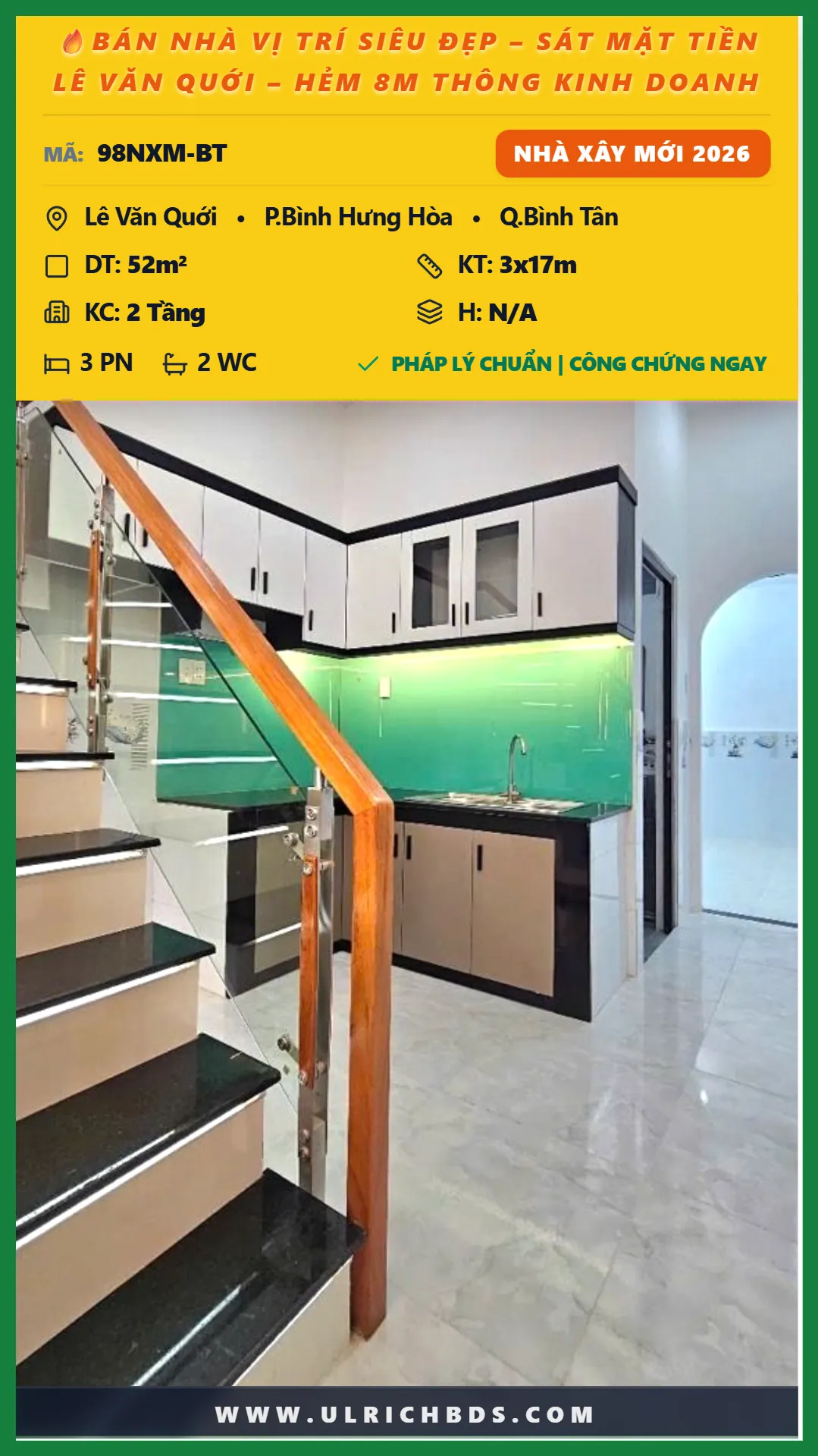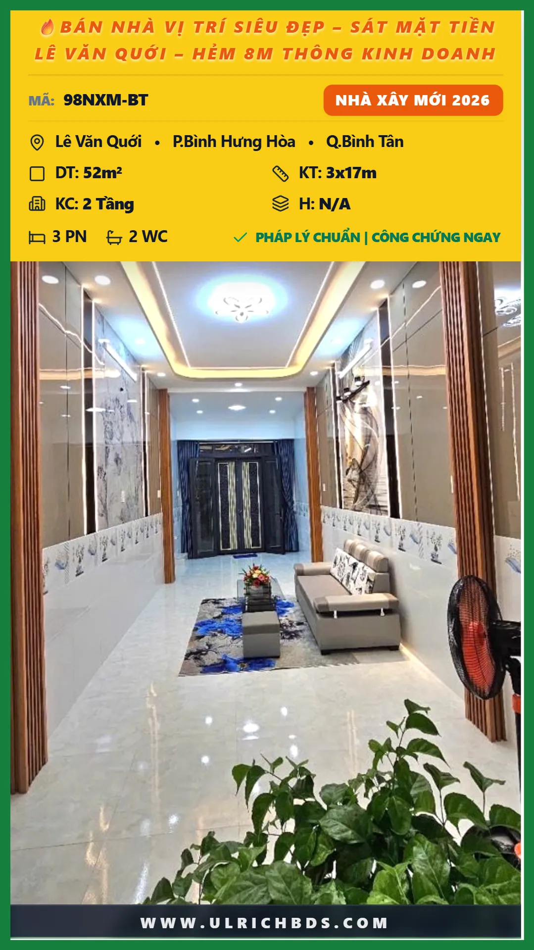 BÁN NHÀ VỊ TRÍ SIÊU ĐẸP – SÁT MẶT TIỀN LÊ VĂN QUỚI – HẺM 8M THÔNG KINH DOANH – GẦN NGÃ TƯ 4 XÃ – GIÁP RANH TÂN PHÚ – SIÊU PHẨM KHÔNG TỲ VẾT